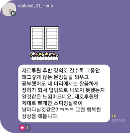 인터넷 광고에 1달이면 원어민과 대화! 3달이면 원어민 수준!이라는 광고를 믿고 강의를 선택하실 수 있겠지만 리얼딜클라쓰 수업은 그런 류의 광고는 하지 않는 것 같습니다. 공부하다보면 진짜 빡셉니다. 그러나 그 과정이 즐겁게 느껴질 만큼 정말 양질의 강의와 자료라는 점과 함께 공부하고 있는 분들의 열정을 느낄 수 있는 대화방과 함께라면 이제는 영어라는 벽을 조금씩 깨부술수 있다는 점을 꼭 느껴보셨으면 좋겠습니다.