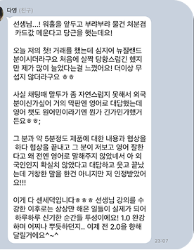단체 채팅방에서 Speaking 1.0, Speaking 2.0를 수강중인 분들의 후기를 보면 저처럼 왕기초였던 분도 리얼딜과 함께 공부하다보니 원어민과 대화를 하게 나눌 정도의 실력을 갖춘걸 보고(물론 엄청난 노력을 동반한) 그냥 기초강의 먼저 들어보고 판단하자에서 올 클리어 패키지로 시작하기를 잘했다는 생각이 듭니다.