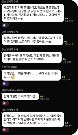 1. 유학도 안 다녀오신 영포자였던 에릭쌤이 스스로 연구하고 결국엔 이 길을 개척해낸다는 것이 정말 크게 와닿았어요. 저는 자수성가, 자기개발을 열심히 하는 사람을 무척이나 존경합니다. 저도 그렇게 되기 위해 자극도 받고 동기부여도 되구요.